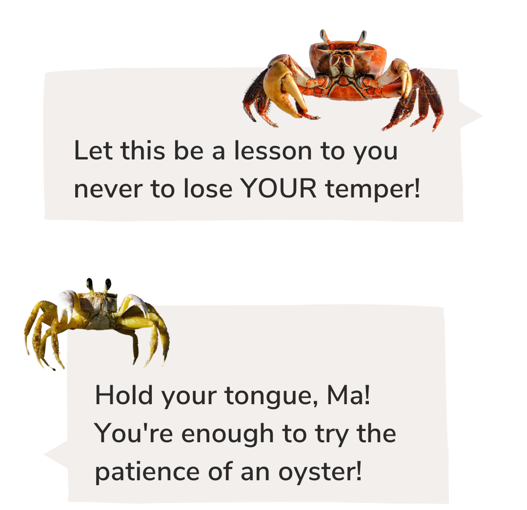 “생쥐가 머무르지 않고 가 버리다니 얼마나 안타까운가!” 생쥐가 시야에서 사라지자마자 로리가 한숨을 내쉬었다. 그러자 나이든 게가 자기 딸에게 말할 기회를 갖게 되었다. “아, 얘야! 이번 일을 결코 화를 내지 않겠다는 교훈으로 삼아라!” “엄마, 잠자코 계세요!”라고 어린 게가 무뚝뚝하게 말했다. “엄마는 굴의 인내심을 시험할 정도로 충분해요.”